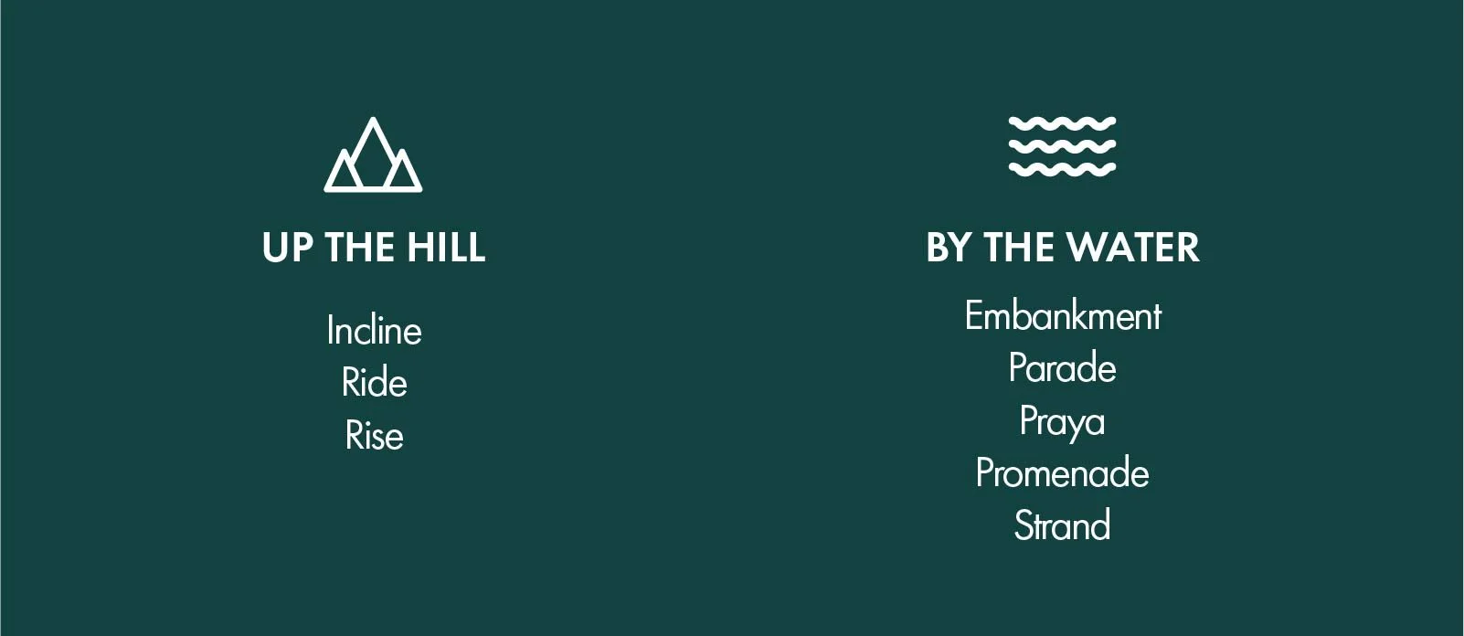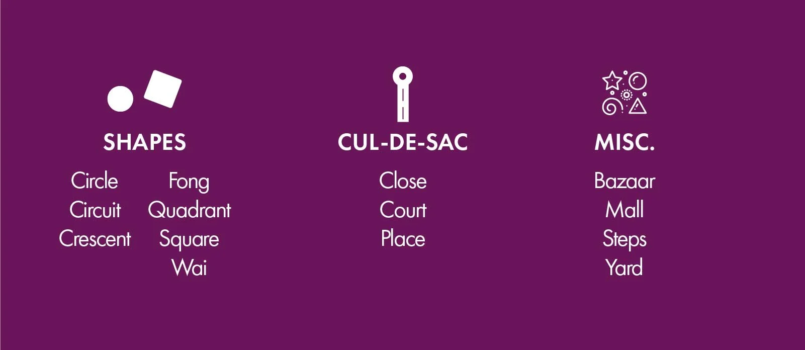 88% of all the thoroughfares in HK are suffixed with ‘streets’, ‘roads’, ‘lanes’, and ‘paths’. In addition to suffixes that describe the thoroughfares’ function, some are named for their shape and geographical attributes.