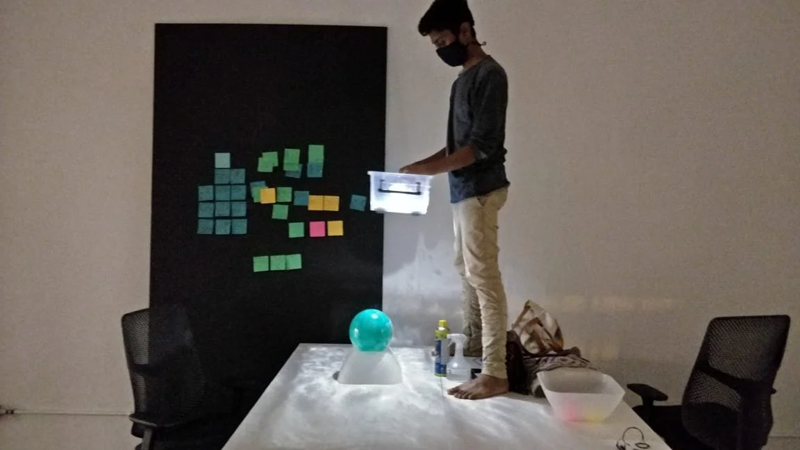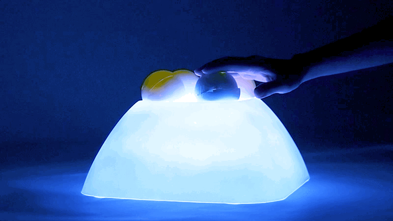 The CES was built using a relay module to link up an air pump with an Arduino Nano33 IoT, allowing the ball to inflate and deflate at a controlled rate, where it acts as a visual representation of communal energy consumption in our imagined world. The smaller handheld balls consist of Neopixel rings and Arduino Nano33 IoT boards to show the consumption of personal energy through dimming and glowing lights.